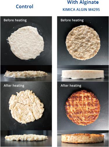 The gelation of alginate does not require heating or cooling. Raw ingredients can be bound and molded as they are. Furthermore, the gel formed by alginate does not dissolve with heat, allowing the formed meat to maintain its adhesive state even during cooking, preventing it from falling apart.