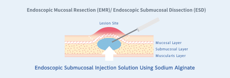 Sodium Alginate is used as a raw material for endoscopic submucosal injection solutions employed to lift lesions during procedures such as Endoscopic Mucosal Resection (EMR) and Endoscopic Submucosal Dissection (ESD).